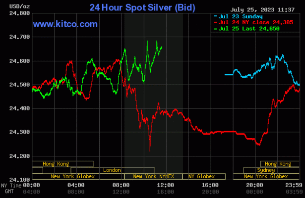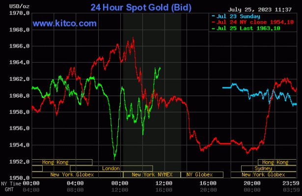 Los precios del oro bajaron ligeramente y la plata subió ligeramente en las primeras operaciones de EE.UU. del martes, ya que la Reserva Federal de EE.UU. comienza su reunión de establecimiento de políticas de dos días esta mañana. El oro de agosto bajó $2,90 a $1959,30 y la plata de septiembre subió $0,134 a $24,715.